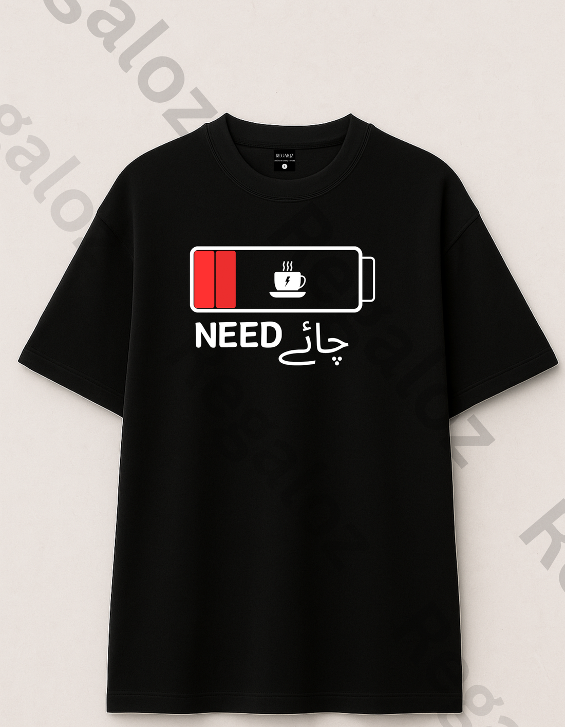 🔋 Need Chai (NEED چائے) Down Shoulder Shirt — By Regaloz Sip the vibe, charge...