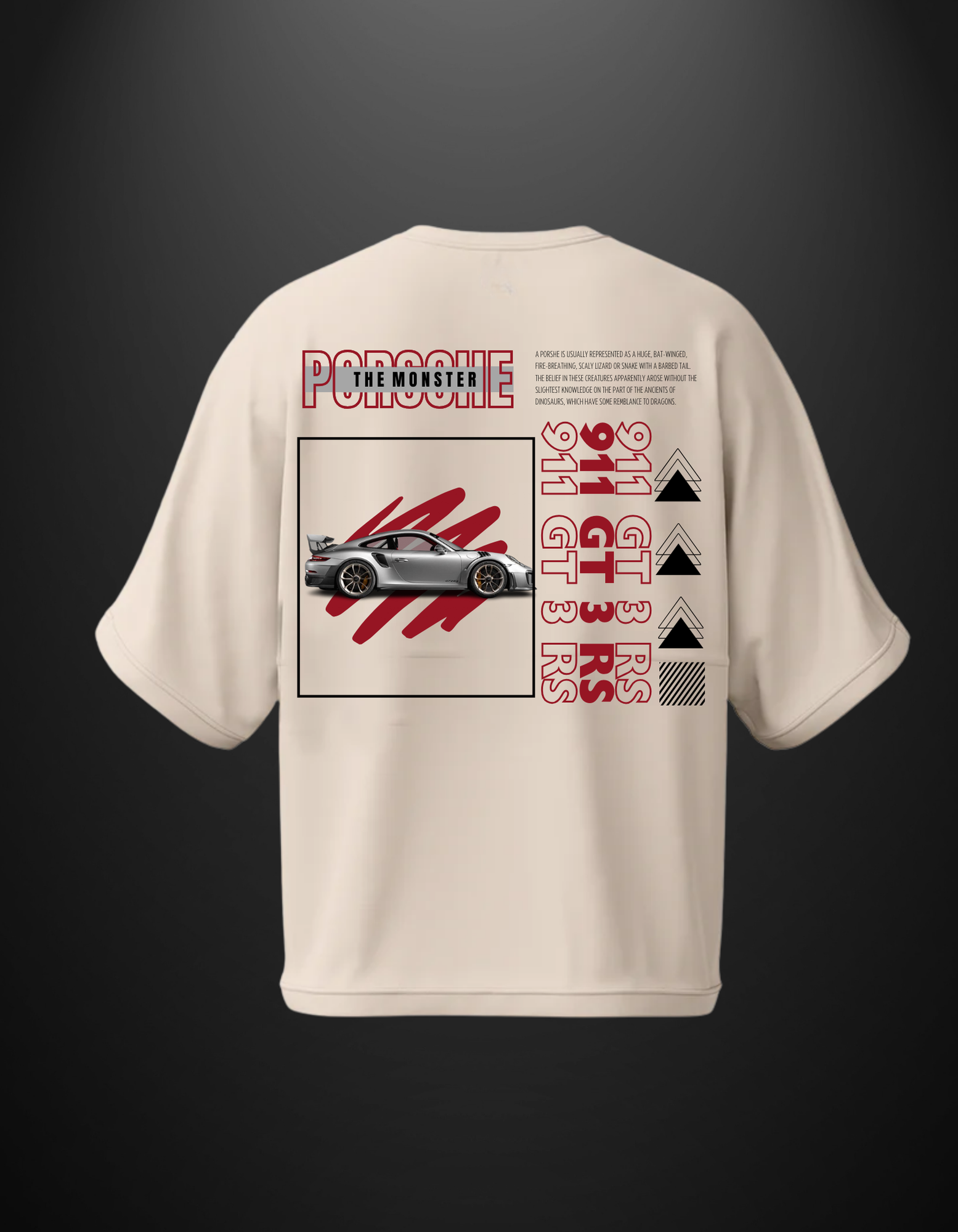 Print: Porsche 911 GT3 RS placed on a gritty grid backdrop with bold βPorsche the Monsterβ and β911 GT3 RSβ text in rich maroonish tones