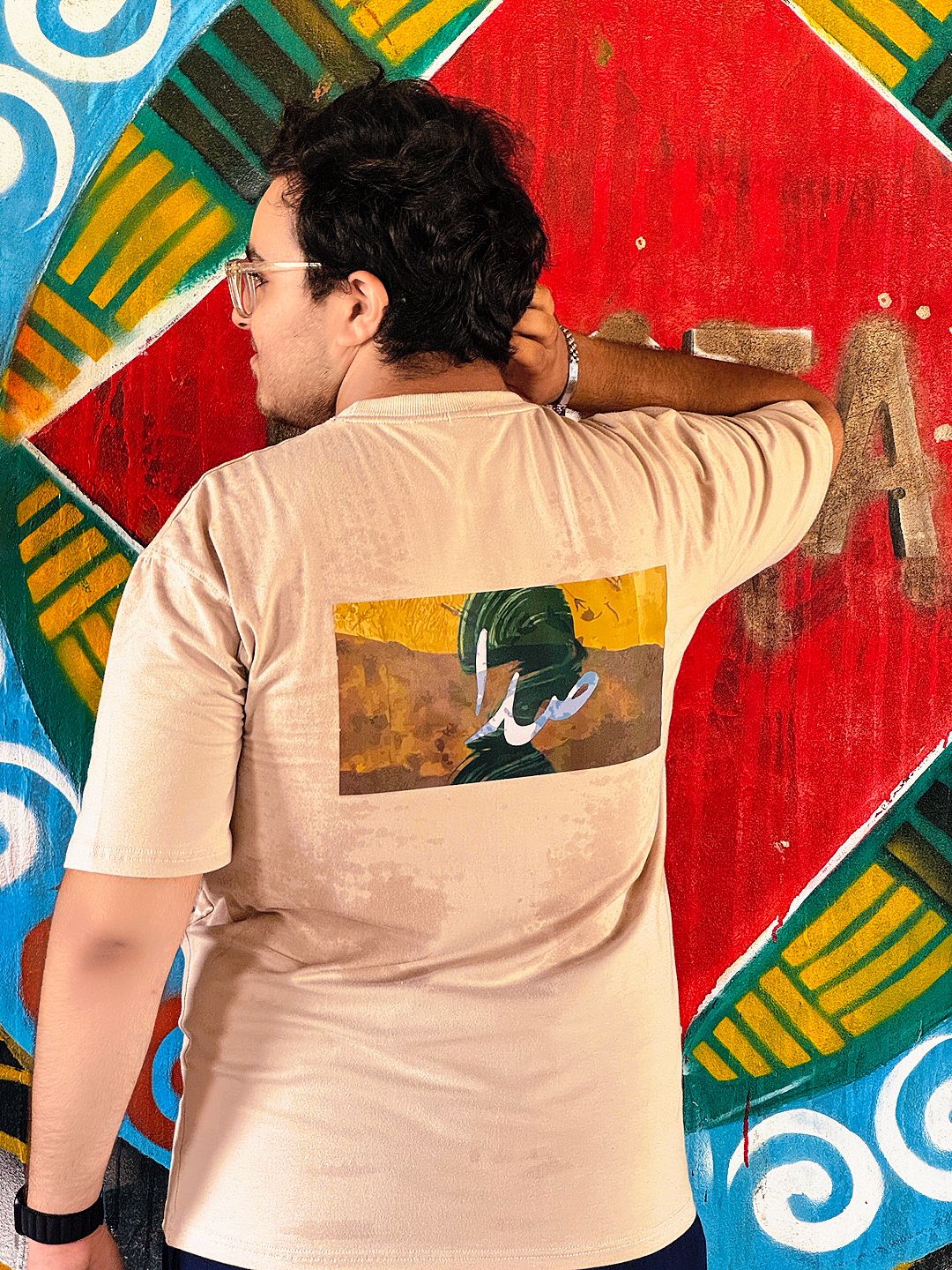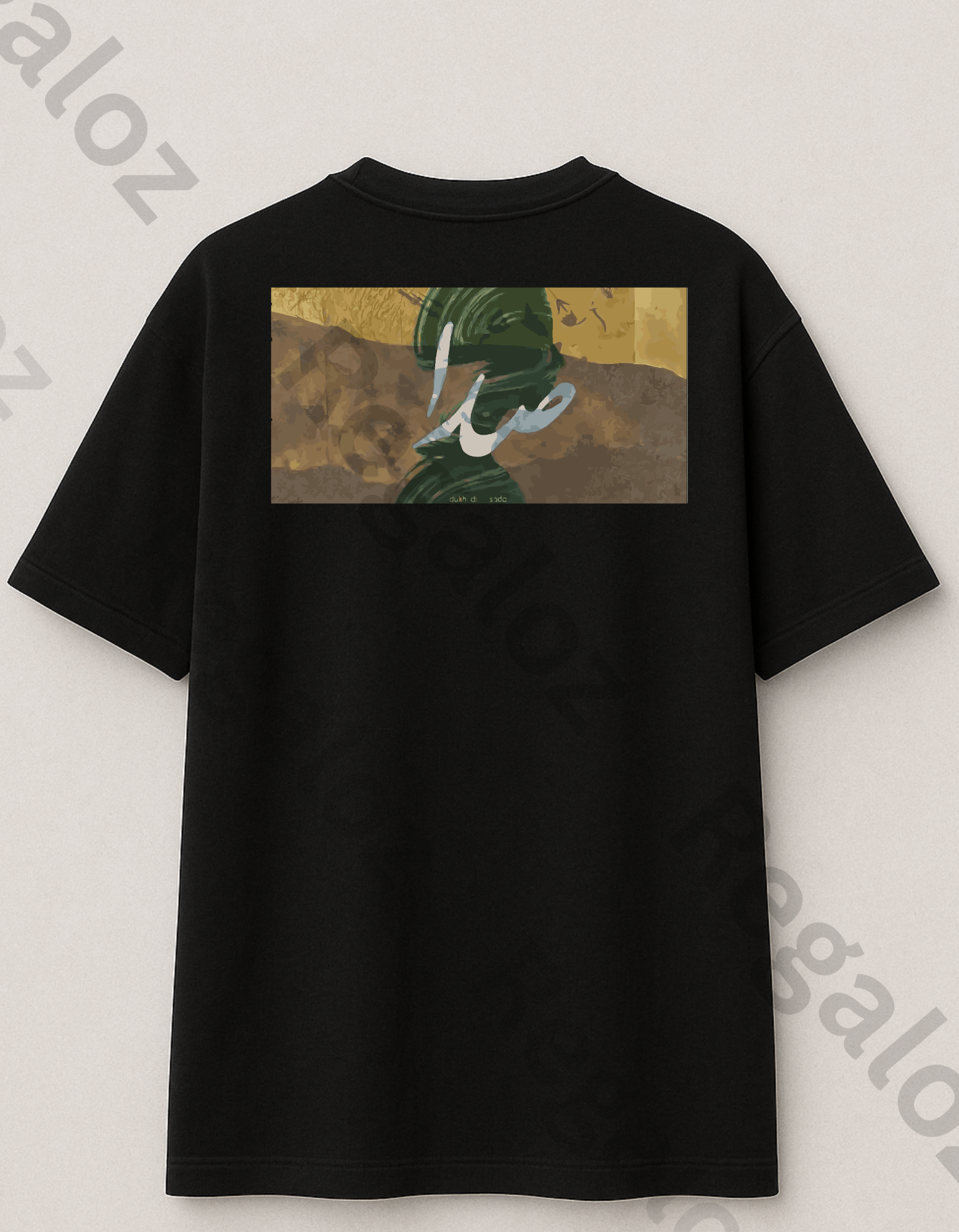 Back Print: "صدا" again on the back — but now stamped over a textured brown-yellow background, designed to look like a gritty wall, not real but raw in vibe. The green curved elements flow through again — connecting front and back in bold harmony.